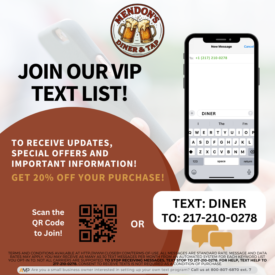 Mendon's Diner & Tap, established in 2007, is a beloved family-friendly hotspot in Mendon, IL, and surrounding areas. Specializing in comforting dine-in and takeout options, we offer a diverse menu ranging from hearty breakfasts to mouthwatering seafood, flavorful chicken dishes, sizzling cheeseburgers, and even specialty frog legs. Our delightful desserts and refreshing cocktails complement our extensive selection of beers. Guests can enjoy our hospitality in our inviting space, including a party room, event room, pool table, claw machines, salad bar, buffet, and bar. Families can delight in our kid-friendly menu, while patrons of all ages can savor our scrumptious brunch offerings. Mendon's Diner & Tap is your go-to destination for a warm atmosphere and delicious comfort food favorites.